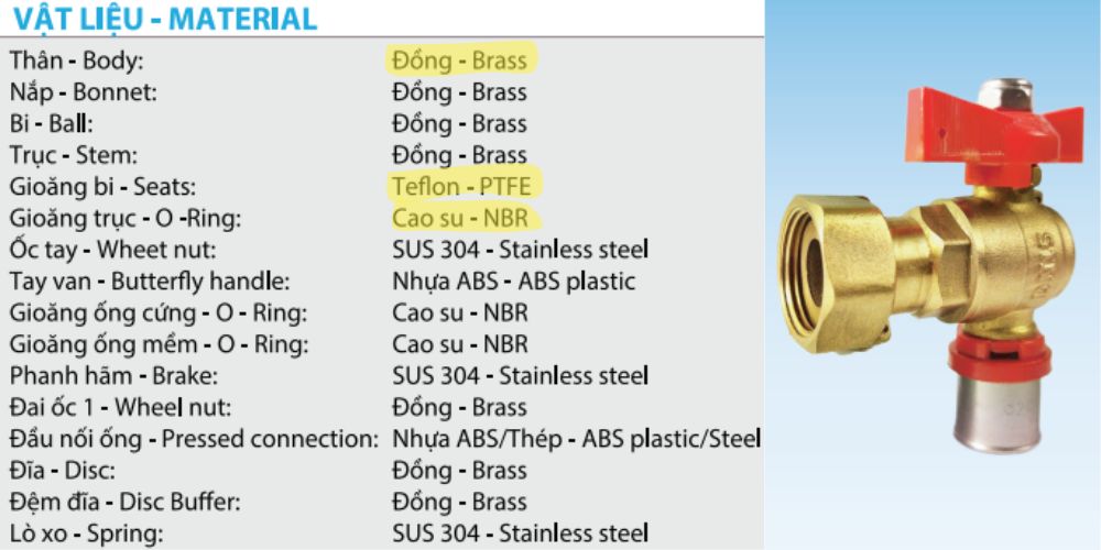 Van góc đồng Miha nối bấm được chế tạo từ nhiều loại vật liệu chất lượng cao khác nhau, chi tiết như sau:
